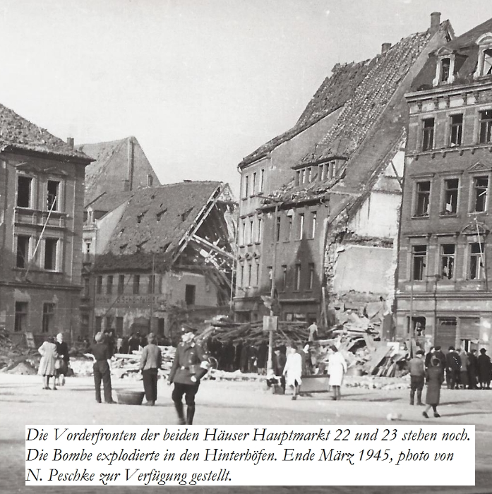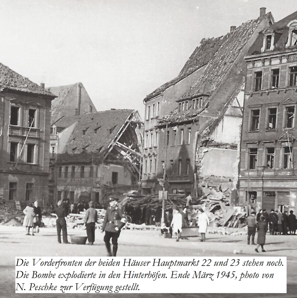 Die Zerstörung des ursprünglichen Hauses erfolgte im März 1945 durch amerikanische Bomben. Die Bombe traf den Hinterhof. Es war Mittagszeit. Die Sirene heulte und alle rannten die Treppe hinunter in den Keller. Meine Mutter sollte das Gas am Herd abdrehen und war die Letzte. Sie fiel mit der Kellertür im Rücken die Kellertreppe hinunter. – Alle überlebten, so aber nicht die Menschen im Keller des Nachbarhauses, das ebenfalls auf der Rückseite getroffen wurde. Meine Familie kaufte das zerbombte Nachbargrundstück; so erklärt sich heute die Doppelhausnummer 22/23.