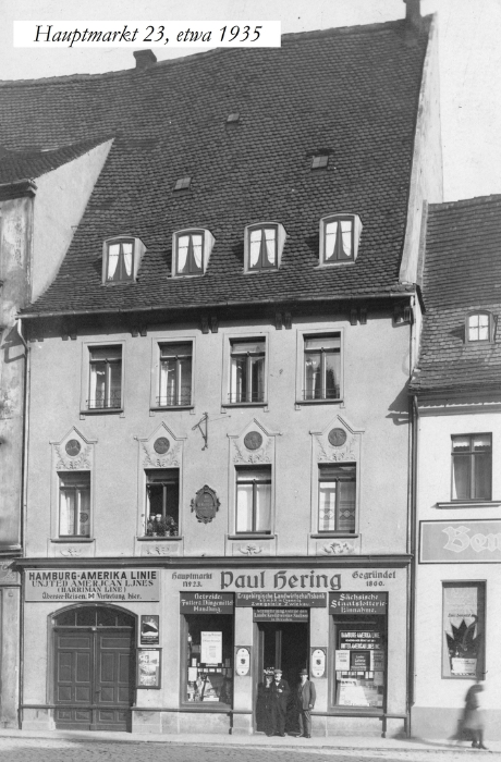 Das Haus ist im Denkmalverzeichnis als Hering’sches Haus eingetragen. Ein Grund dafür liegt in der Erfolgsgeschichte der Firma Paul Hering, die im Haus 23 1860 gegründet wurde. Von einer Materialwarenhandlung entwickelte sie sich sehr rasch zu einer Kolonial-und Tabakhandlung, durch die Waren nach Zwickau gebracht wurden, die vorher unbekannt waren. Auch kamen die exotischen Händler mit ihren dunklen Hautfarben und fremden Trachten nach Zwickau. Der Aufgeschlossenheit meiner Familie ist es zu verdanken, dass schon 1872 Düngemittel wie Thomasmehl, Kalisalz und Kalisalpeter in Zwickau verkauft wurden. Die Bauern sahen innerhalb eines Jahres den Düngemittelerfolg bei der Ernte und der Ruf der Firma war begründet. Es war ein radikaler neuer Ansatz um den Ernteertrag zu vergrößern, der damals durch die Bevölkerungsexplosion dringend notwendig war.
